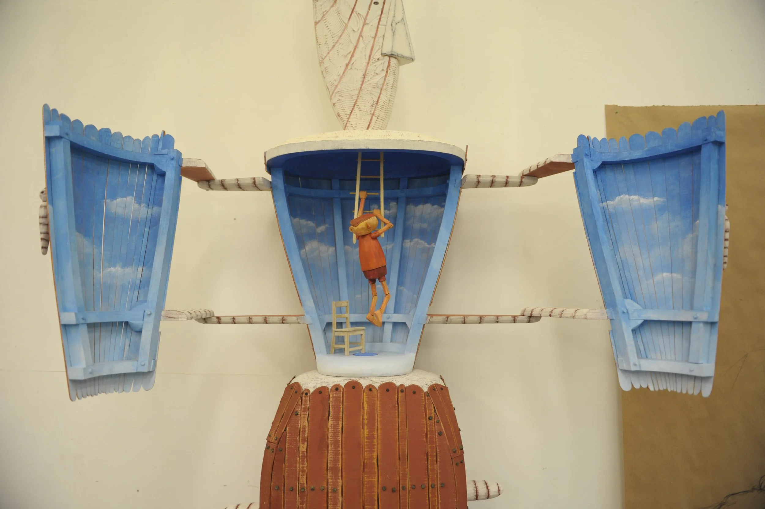 The work I have been doing has been involved in a number of directions. Large pieces that explore ideas about god and the spiritual ideas controlling us. Or is it us controlling spiritual ideas. Smaller pieces, cabinets, and sculptural furniture, incorporating similar ideas. Then there are the heads. All three directions have been using the human figure as a central theme. While the figure is generally a simplified representation, I hope it takes on deeper meanings in context with the ideas it contains. In some cases there are implied narratives, but in most cases the images are made up of meaningless/ meaningful connections. As I am playing around with ideas, I look for ones that have these connections I do not understand. Those are the ideas that have the most interest and mystery for me. If I find I know what the piece or idea is about, it is less likely to engage me in conversation, and, I believe, is less likely to engage the viewer in a lasting conversation.